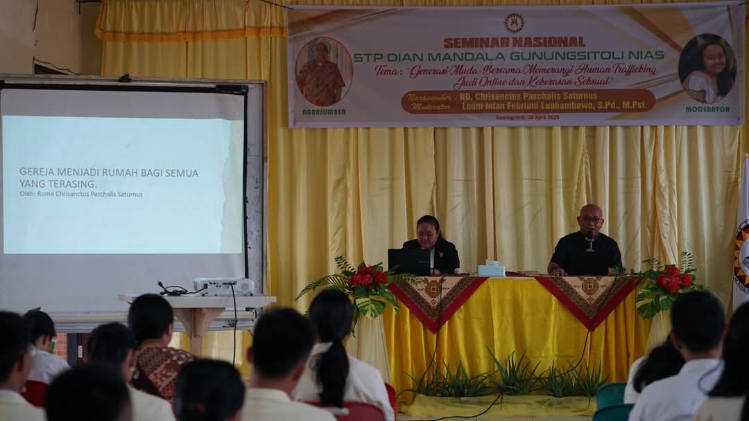 Senin, 27 April 2025 STP Dian Mandala Gunungsitoli menyelenggarakan Seminar Nasional dengan Tema "Generasi Muda: Bersama Memerangi Human Trafficking, Judi Online dan Kekerasan Seksual". Seminar ini diadakan di ruang auditorium kampus STP Dian Mandala Gunungsitoli yang dihadiri oleh dosen, tenaga kependidikan dan semua mahasiswa. Sementara narasumber pada seminar nasional ini ialah RD Chrisanctus Paschalis Saturnus, atau akrab disapa dengan Romo Paschal.